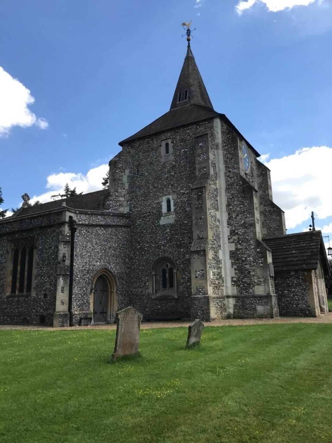 But, we were abruptly stopped just before the pub which was surrounded by trucks, people, lights. It turned out to be a film crew who were using the pub in a new Agatha Christie mini-series “Why didn’t they ask Evans?” written and directed by Hugh Laurie. Our hopes for lunch were dashed but we were allowed to go into the grounds of the church opposite. This was not the church in which Fanny and Alexandre d’Arblay were married but a later replacement. We walked up the lane from the spot where Susan’s cottage had been to the church just as Fanny had done at 7 am on Sunday 28 July in 1793.